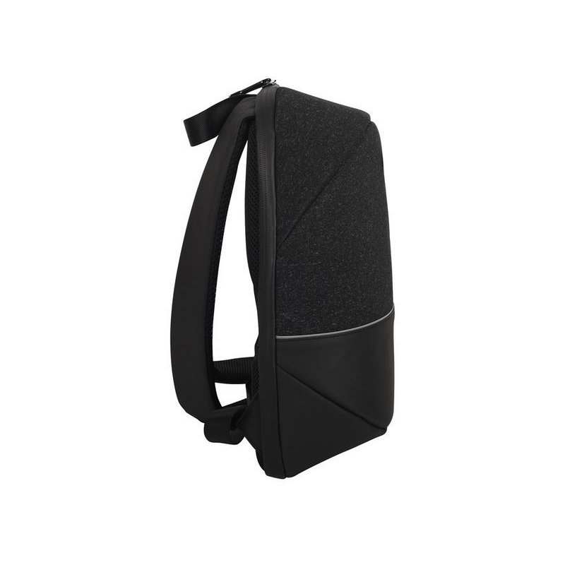 Рюкзак выполнен из прочного полиэстера чистого черного цвета и черного с мелкими белыми вкраплениями. Граница между ними обозначена белой линией, что вносит определенный акцент и разбавляет строгость дизайна. Рюкзак имеет ручку для переноски и два широких утолщенных плечевых ремня, которые регулируются по длине. Спинка рюкзака ортопедическая, что делает процесс его ношения максимально комфортным и безопасным для здоровья.
