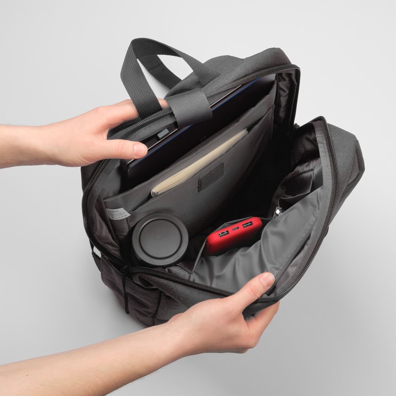 Компактный городской рюкзак Forst. С внешней стороны рюкзака размещены два кармана на молнии: один небольшой, который можно использовать для телефона, ключей, проездных карточек и других мелочей, другой – вместительный, для более крупных предметов.