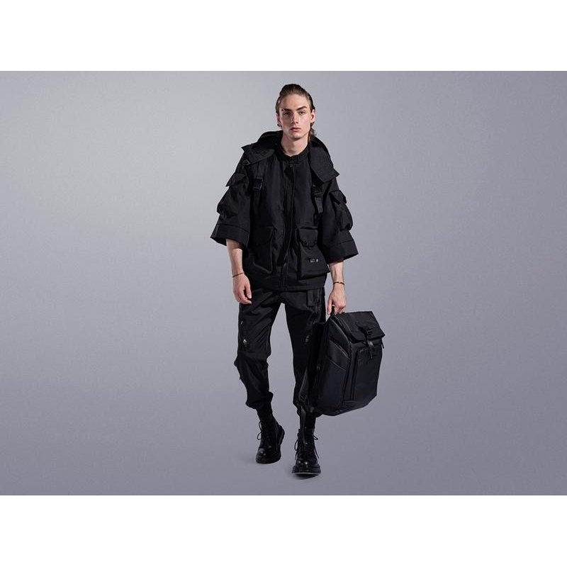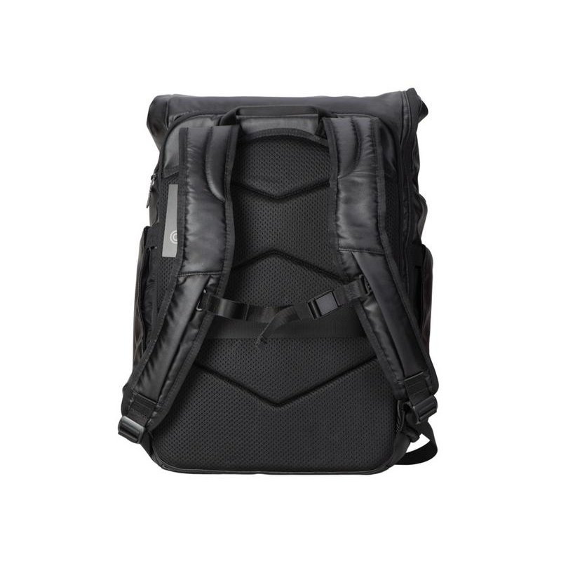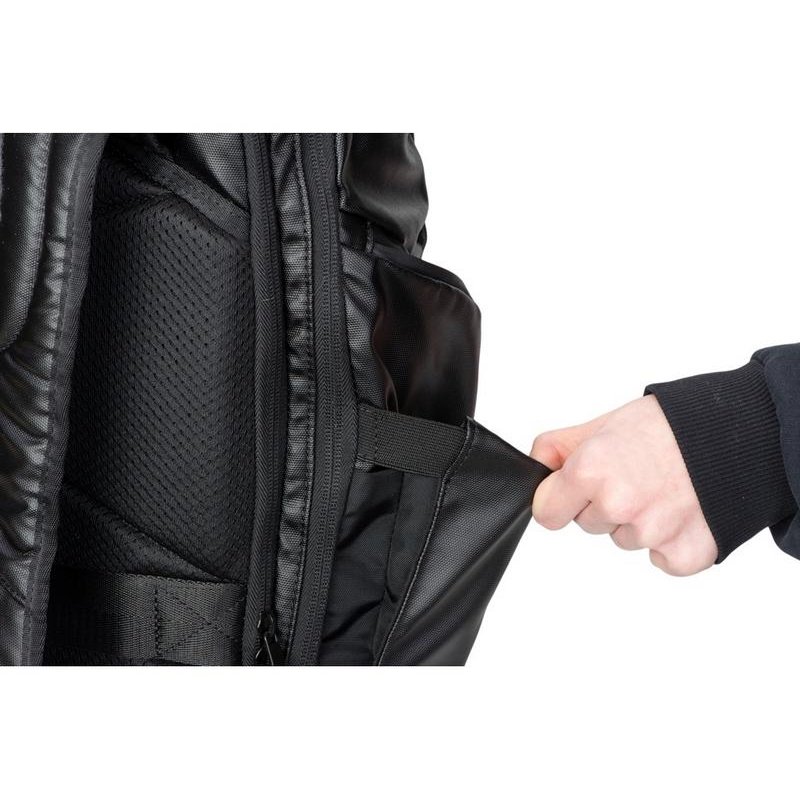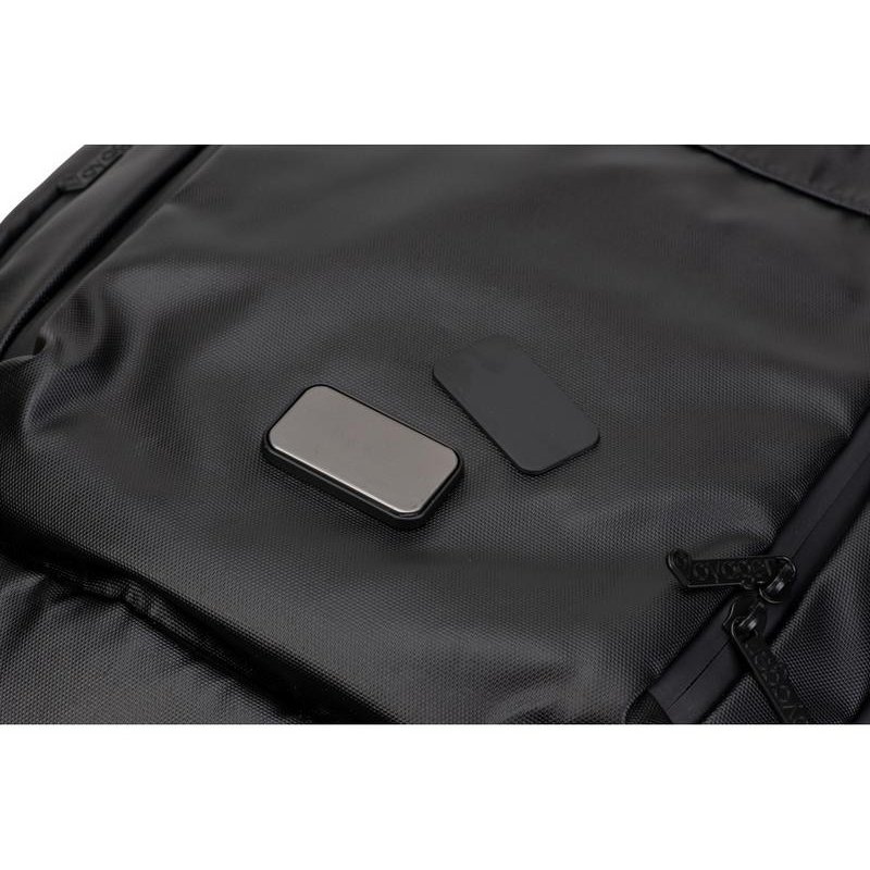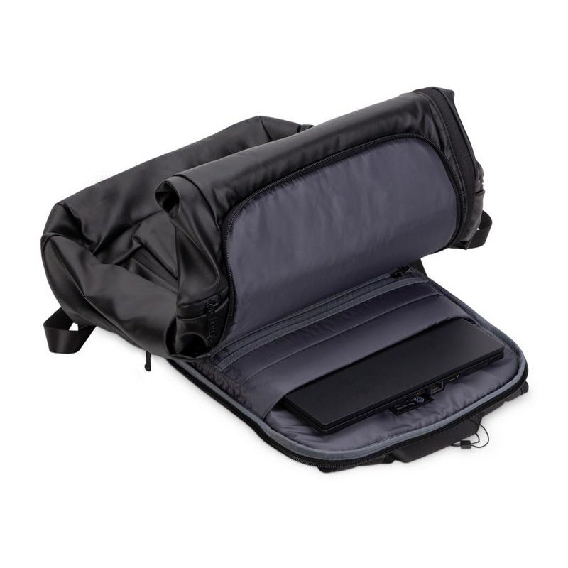 Состоит из 2х отделений - для ноутбука и планшета и основного большого отделения, которое закрывается на магнитный фиксатор вверху. Внутри каждого отделения есть сетчатый карман на молнии для удобства хранения личных вещей. Снаружи расположен передний карман на молнии. Боковой наружный карман с каждой стороны состоит из 2х отделений: большого на молнии и меньшего, расширяющегося с помощью эластичной вставки. Благодаря двойным бегункам молния основного отделения открывается сверху и сбоку. В рюкзаке предусмотрено много полезных мелочей для удобства использования: