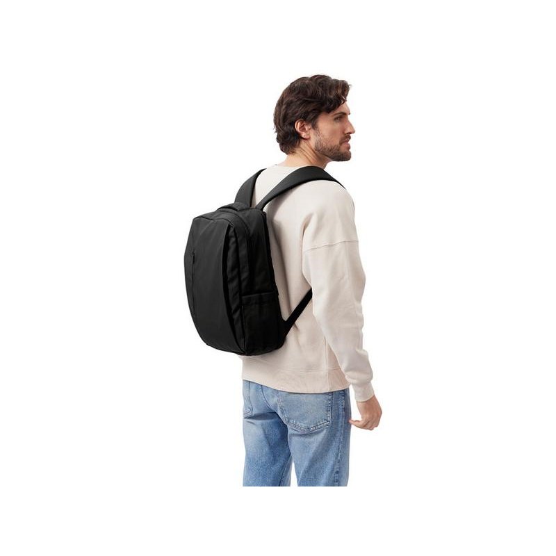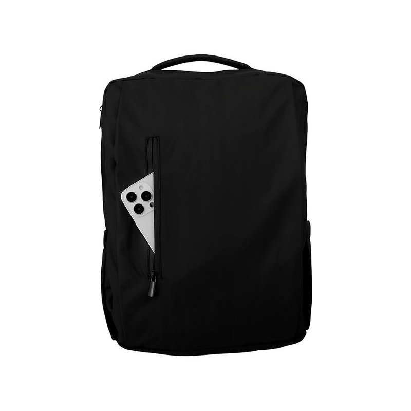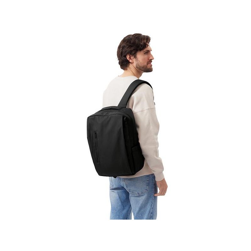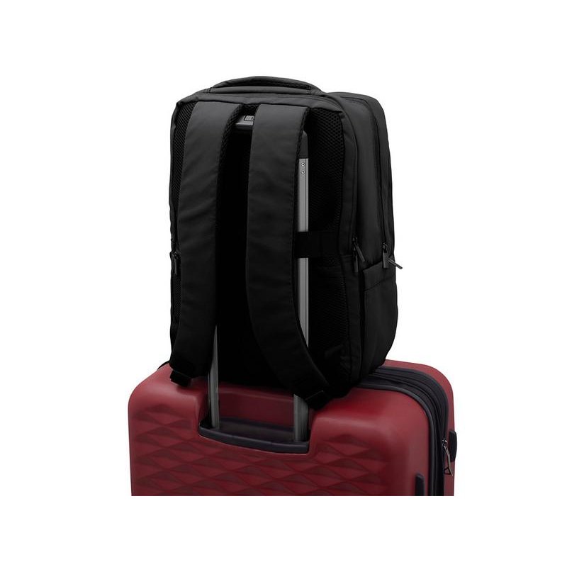Непромокаемый бизнес рюкзак с двумя вместительными отделениями и карманом на молнии спереди. В одном отделении расположены карман для ноутбука и планшета, в другом органайзер и много пространства для одежды и других вещей на случай деловой поездки. На сетчатой спинке расположен потайной кармана на молнии для документов и личных вещей и ремень для крепления на ручку чемодана. Сверху удобная мягкая ручка для переноски. Лямки регулируются по длине.