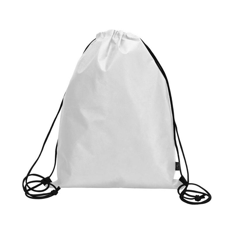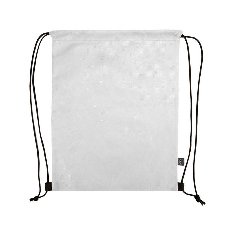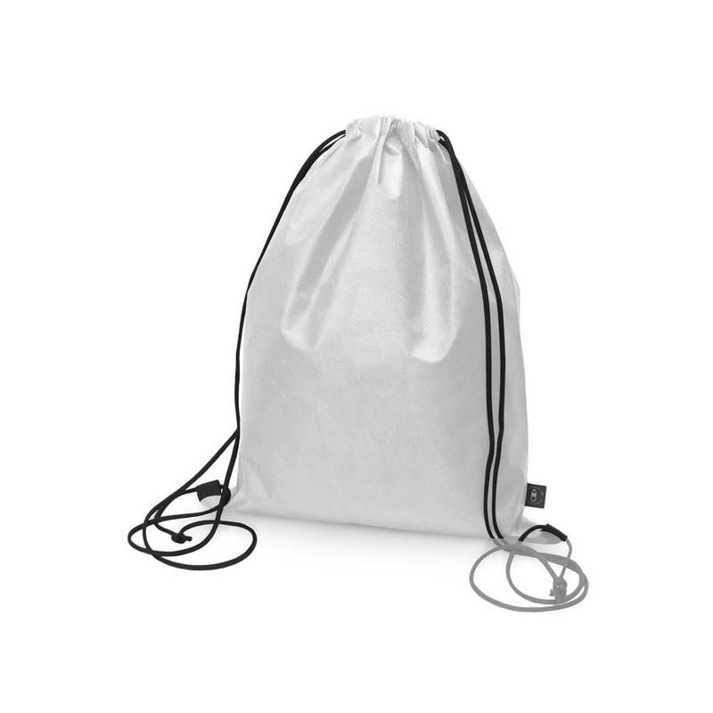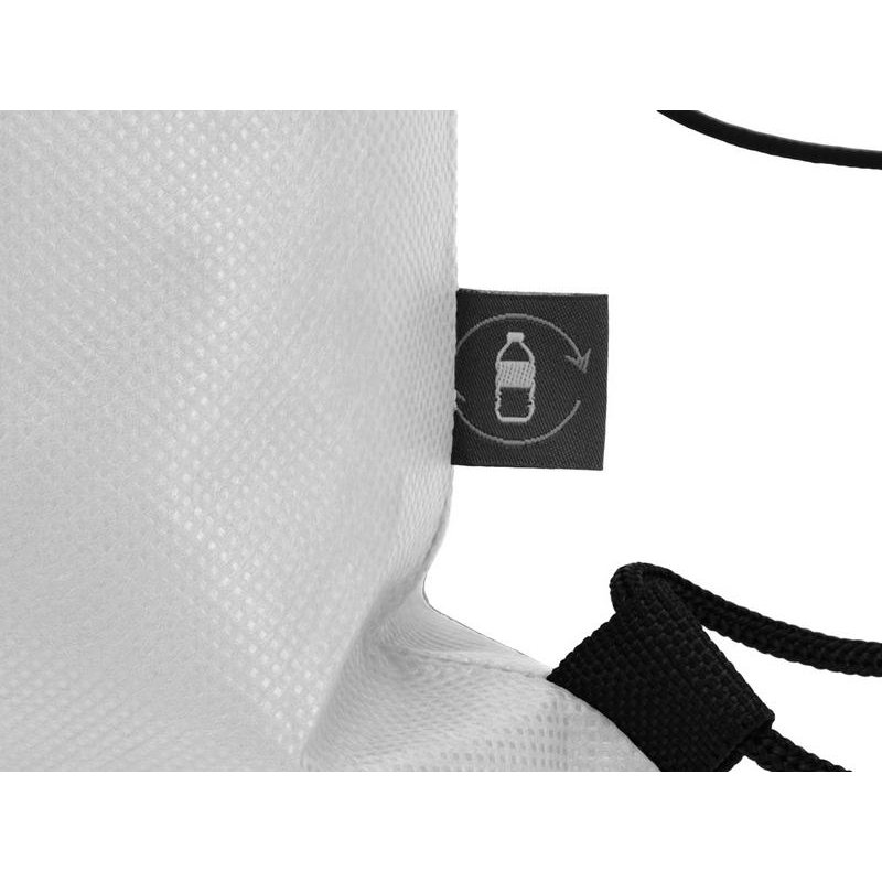 Рюкзак-мешок изготовлен из переработанного пластика. Затягивается с помощью двух боковых шнурков.