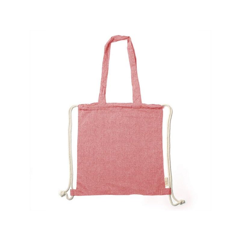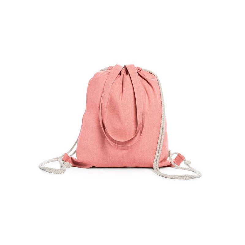 Рюкзак-мешок из переработанного хлопка плотностью 140 г/м² с меланжевой отделкой, ручками длиной 70 см в тон и шнурками натурального цвета.