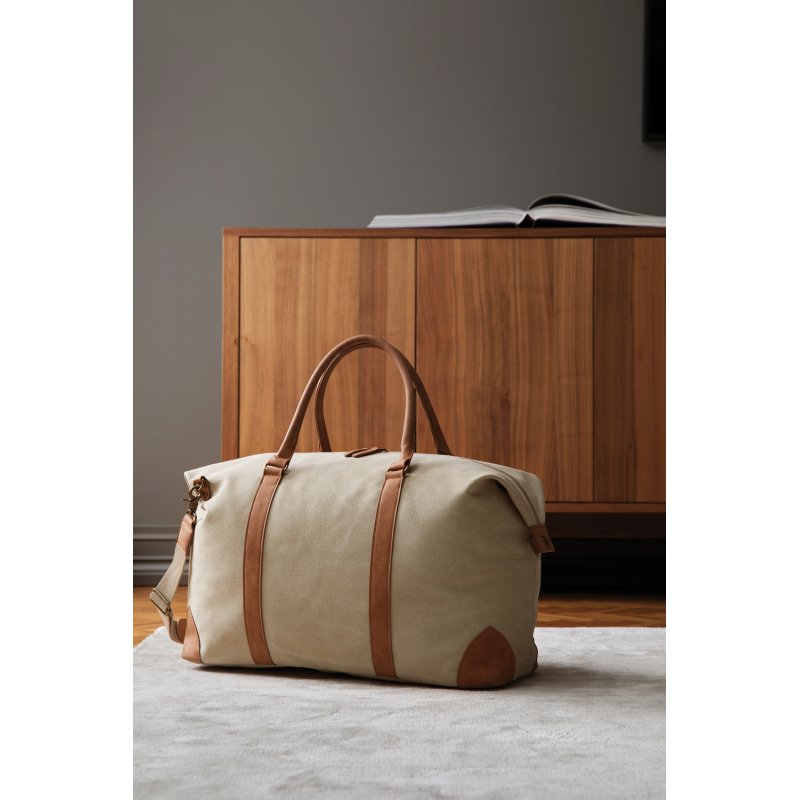 Дорожная сумка из коллекции Bosler изготовлена из канваса: на 40% он состоит из переработанного полиэстера, а на 60% — из переработанного хлопка. Ткань получается плотная и прочная, но при этом легко складывается для удобного хранения. Ручки и декоративные элементы изготовлены из искусственной кожи, фурнитура — из латуни. Если вы любите классику и ретростиль, эта сумка непременно придется вам по душе.