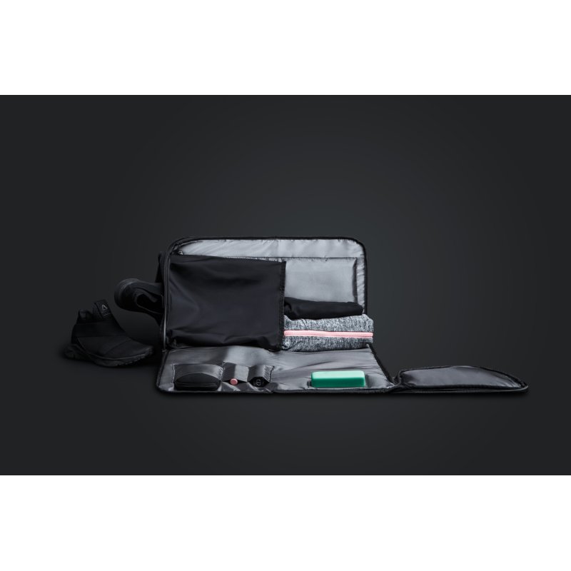Спортивная сумка-трансформер FlexPack Gym со светоотражающими элементами, водонепроницаемым отделением и съемным плечевым ремнем. Сделана из прочного устойчивого к порезам и трению водоотталкивающего многослойного полиэстера, не требующего специального ухода. Бока выполнены из дышащего материала, который обеспечивает вентиляцию основного и водонепроницаемого изолированного отделений и препятствует появлению в них неприятного запаха, что крайне важно для спортивной сумки. Еще одной особенностью сумки является возможность трансформации в плоский пакет, который легко хранить и брать с собой. Благодаря единой молнии, идущей по всей сумке, она складывается, упаковывается в пришитый чехол и приобретает компактные размеры 26х26х8 см. В рабочем состоянии сумка имеет размер 49х26х23 см, ее объем 18,6 л. Внутри основного отделения есть несколько функциональных карманов: 3 небольших кармана для мелких вещей, карточек и т п, большой карман на молнии для одежды размером 40х20 см, внутри него еще 2 кармана длиной 16,5 и высотой 13 см. Закрывается сумка на прорезиненную водонепроницаемую молнию со светоотражающей полосой. Застежки молнии блокируются на кодовый замок TSA007 с функцией таможенного досмотра. Сбоку сумки вход на молнии в специальное водонепроницаемое вентилируемое отделение для обуви, мокрого полотенца, купальника, душевых принадлежностей. Отделение треугольной формы 23х20 см, глубиной 26 см. С внешней стороны сумки находятся 2 кармана на прорезиненных водонепроницаемых молниях со светоотражающими полосами. Длина карманов 17 см, высота 13 см, в них можно положить телефон, ключи и прочие мелочи. Для дополнительной безопасности посередине сумки идет светоотражающая серебристая полоса. Сумка FlexPack Gym оснащена съемным плечевым ремнем с регулируемой длиной. Вес сумки всего 820 гр. Сумка идеальна для бассейна, спортивного зала, фитнеса.