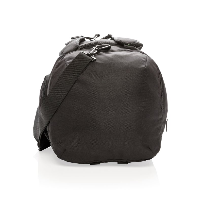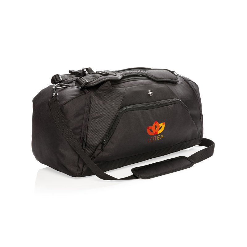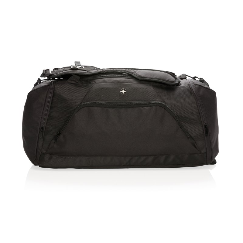 Сумка 2-в-1 из легкого полиэстера плотностью 1680D и 600D. Может использоваться и как рюкзак, и как спортивная сумка. Имеет просторное основное отделение с U-образной верхней застежкой-молнией, боковое отделение для обуви или грязной одежды и боковой карман на молнии. С задней части расположена сетка-держатель для бутылки с водой и удобный кармашек быстрого доступа.В передней части – карман на молнии с двумя отделениями с RFID защитой от считывания данных. Регулируемые плечевые ремни для удобства и функциональности. Материал не содержит ПВХ.