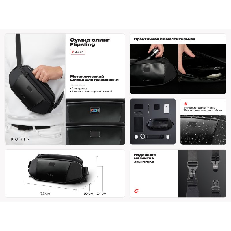 Сумка-слинг- модный и стильный аксессуар. Выполнена из водостойкого материала с водонепроницаемыми молниями. Отделка из экокожи. Расширяющийся водостойкий карман для хранения бутылки или зонта. Потайной карман сзади на магните. Лямка из нескользящего материала 130 см на магнитной застежке. Поставляется в коробке с ручкой.
