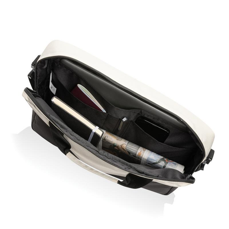 Сумка для ноутбука 15,6’’ — это стильное решение для тех, кто предпочитает классику и заботится о природе. Внутреннее отделение для ноутбука с мягкой подкладкой гарантирует безопасность техники. Дополнительные отделения внутри позволят взять с собой документы, ежедневник, зарядные устройства и другие нужные вещи. Внешний карман на молнии подойдет для мелочей, необходимых под рукой. Сумка изготовлена из переработанных пластиковых бутылок. Содержание вторичных материалов: 100%. Сертифицировано AWARE™. Наличие индикаторных частиц AWARE™ подтверждает, что мы действительно используем переработанные материалы. 2% с продажи каждой вещи, отмеченной сертификатом AWARE™, мы перечисляем в поддержку всемирной организации Water.org.