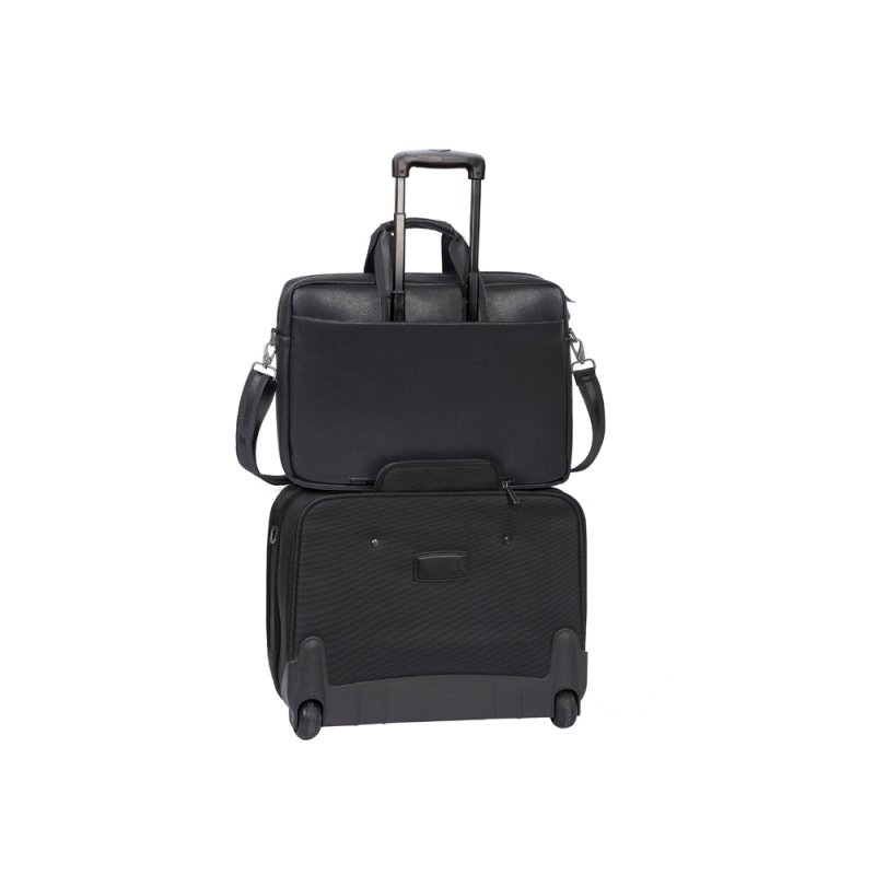 • На задней панели имеется карман на молнии для крепления сумки к ручке чемодана.